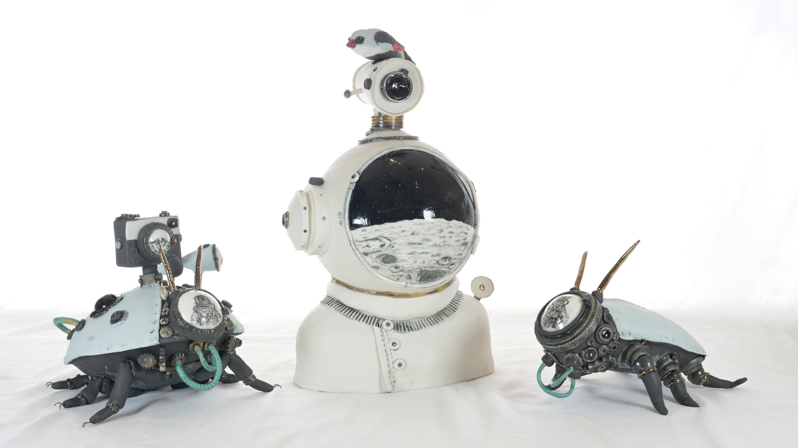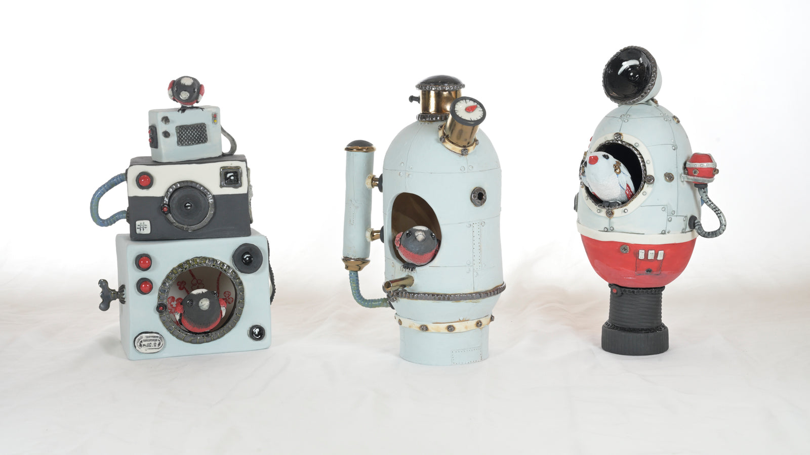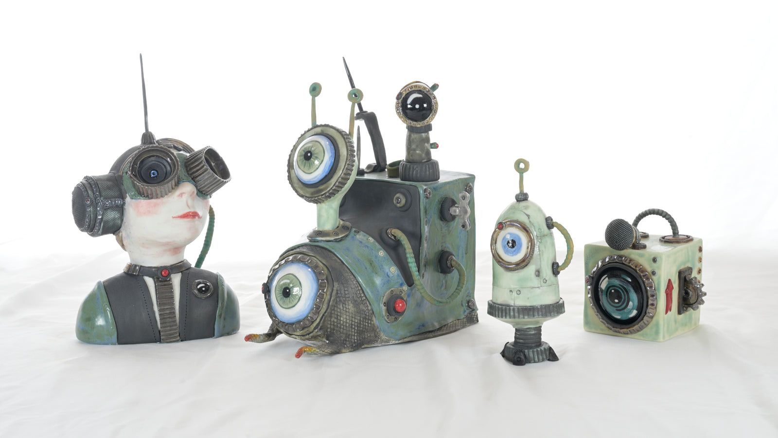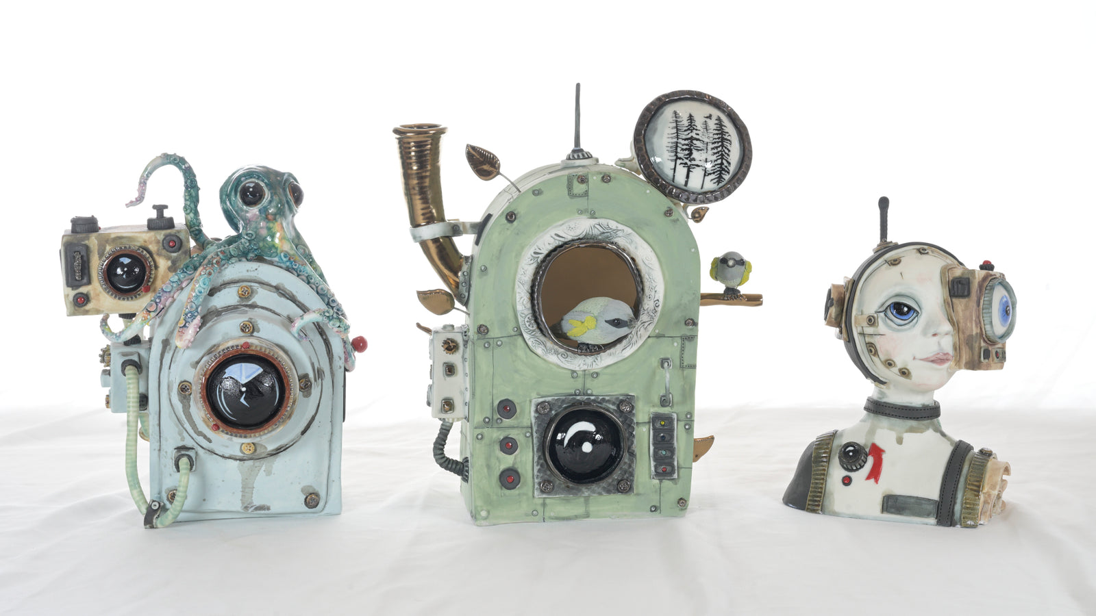 My ceramics practice explores the interplay between nostalgia, technology, and the natural world. Inspired by old-style cameras and steampunk aesthetics, I craft intricate machines in porcelain that blend the mechanical with the animate, incorporating animals and human figures into my sculptural forms.