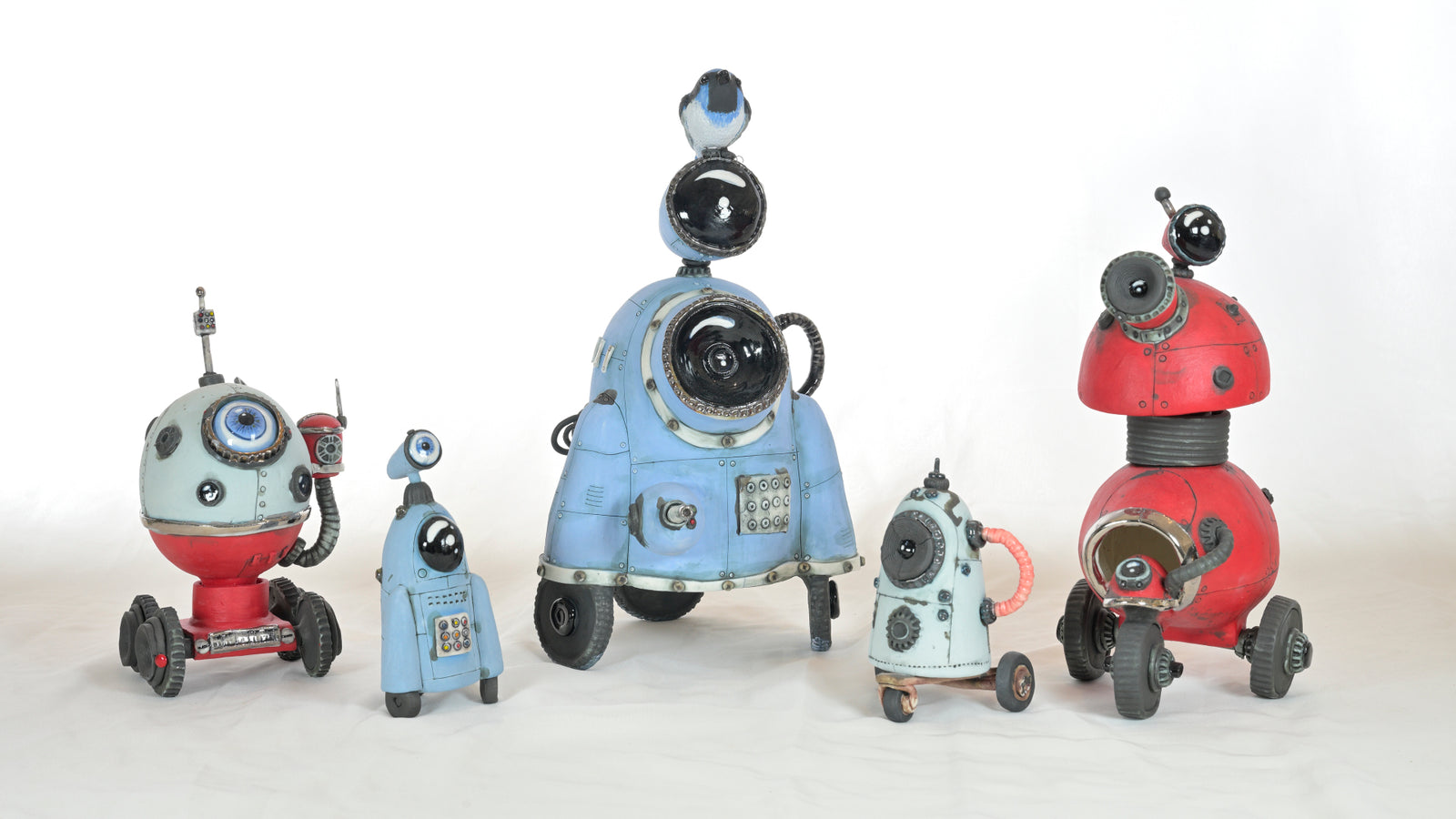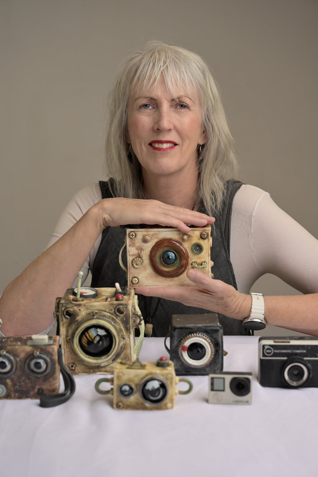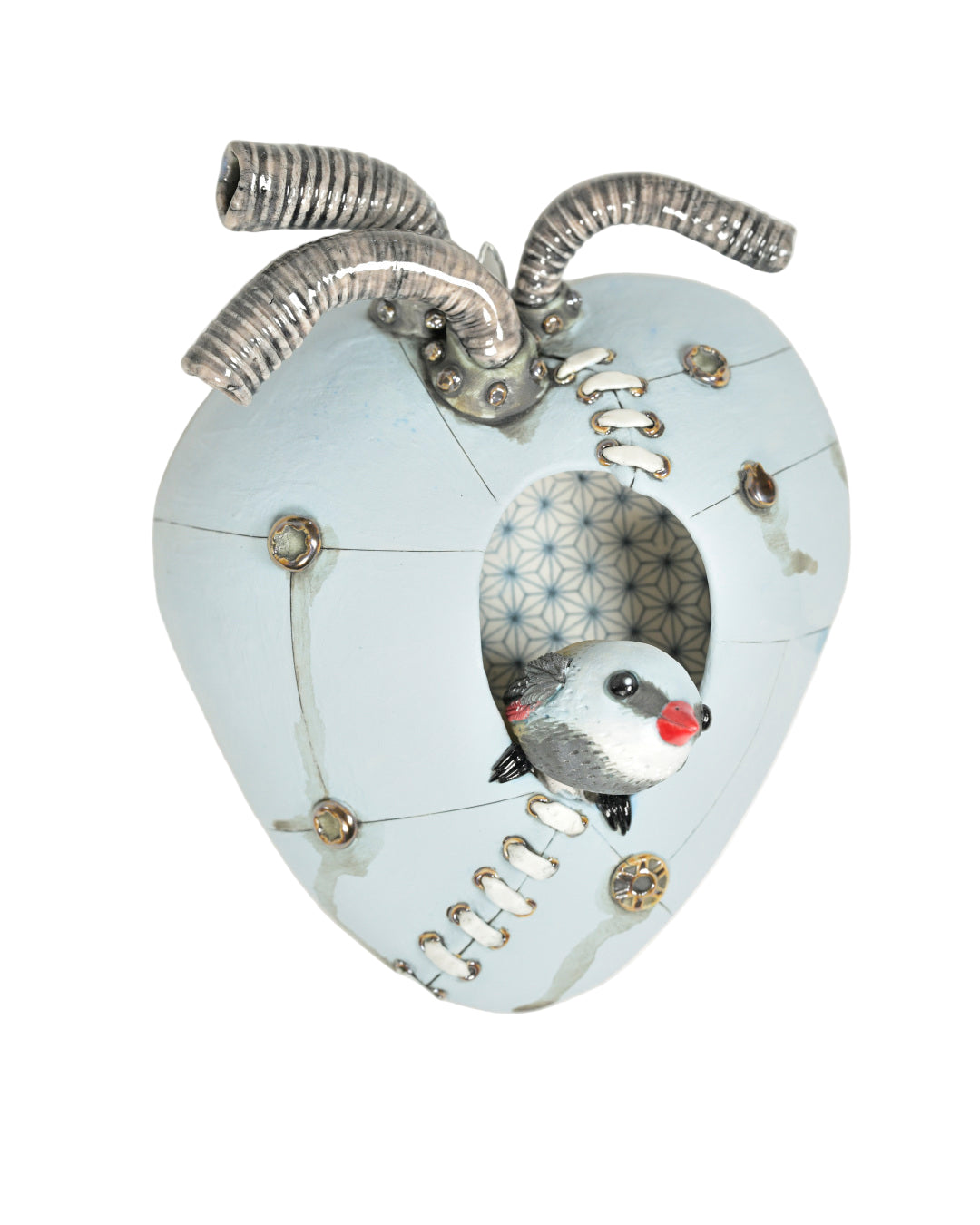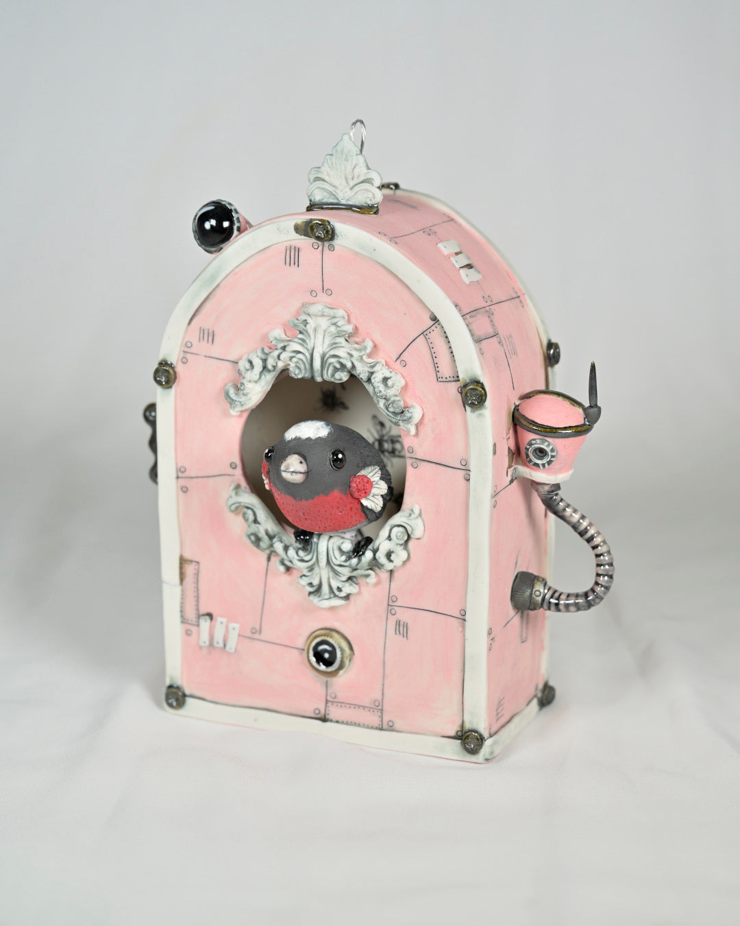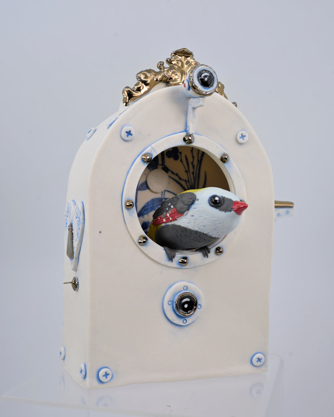 My ceramics practice explores the interplay between nostalgia, technology, and the natural world. Inspired by old-style cameras and steampunk aesthetics, I craft intricate machines in porcelain that blend the mechanical with the animate, incorporating animals and human figures into my sculptural forms.
