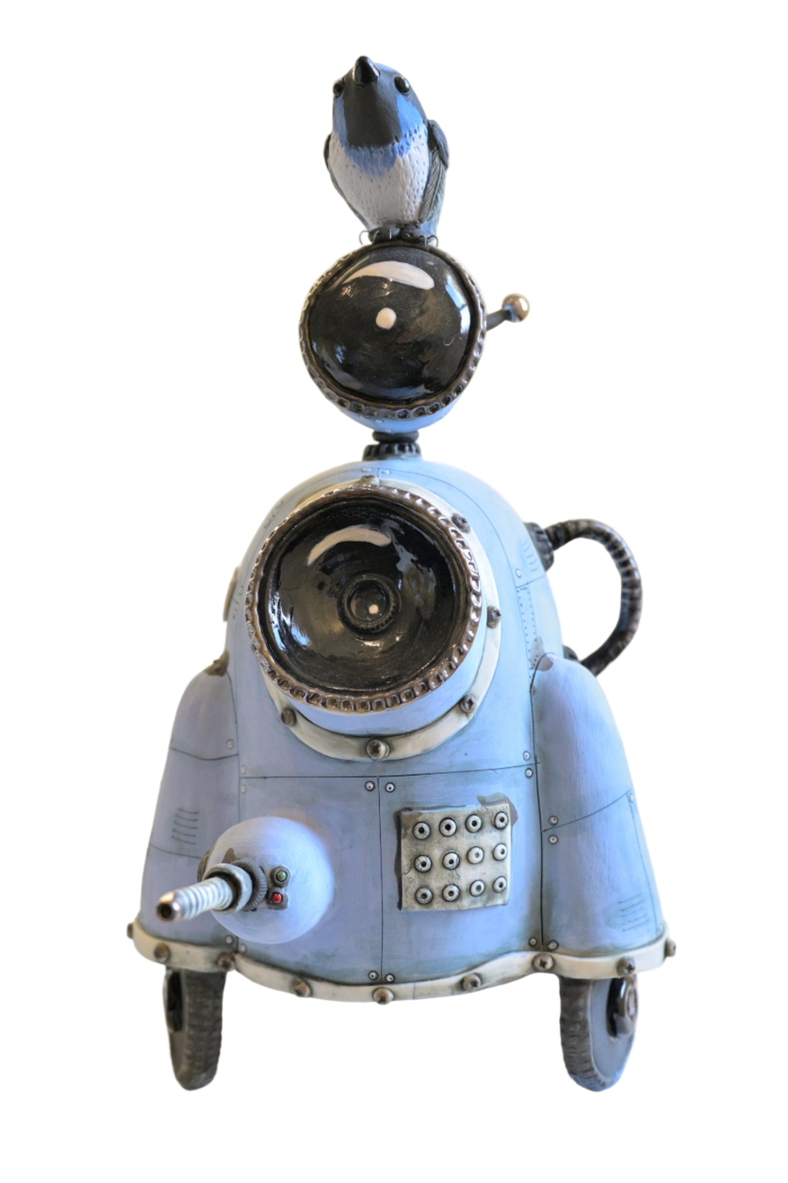 – Sold OutRetro robot on wheels, bird on board. Touring with plumage and purpose.